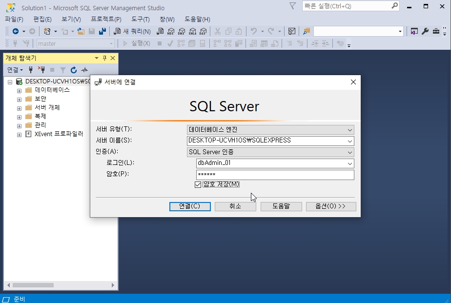 서버 인증 모드를 윈도우와 서버 통합 인증으로 바꿔주면 해결됩니다.